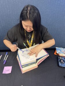 They came through to hand out tickets fairly early – I wanna say around 2:10-2:15 (it started at 2:30), and I probably should have gone to see Poranek as soon as I got the tickets I wanted. I was hoping to Uber over to see her and come back, but was stressed about when to do it. I stayed, hoping I could get through Axie Oh’s line quickly enough to go do that and come back in time for Marissa Meyer at 3:30. My friend Rahma joined me in line sometime in the hour before it started, so I had some company!