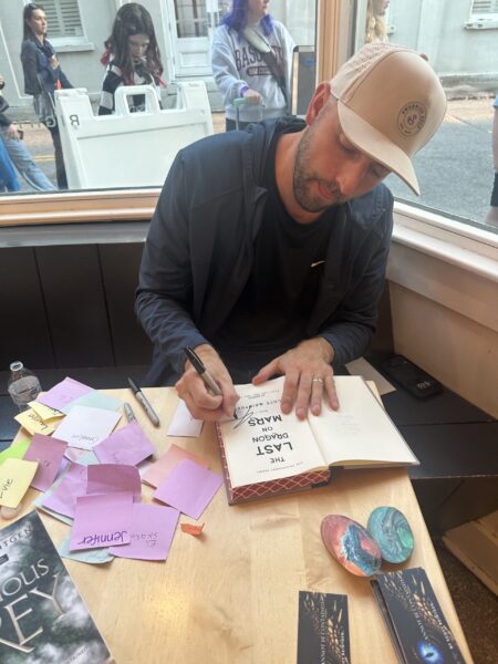 While I was in line, I noticed that Axie was standing around nearby chatting with Marie Lu, so I was able to run over and get my poster signed after all! Marissa’s line took forever and I didn’t get out of it until 4:40. I was in a bit of a panic because Scott had been signing for 40 minutes and they don’t usually go past an hour. I got an Uber to Off Track Ice Cream (3 miles away because it was on the far end) because I figured it’d be faster. It took 20 minutes to get there because traffic was so awful, and my Uber driver was stressing me out because he was honking at people at lights – like, where tf are they gonna go?! They can’t go anywhere! I made it right at 5:00, and by some miracle he was still there and I was able to get my book signed.