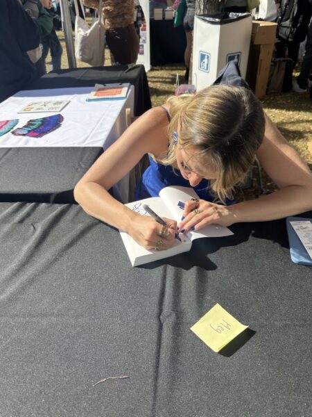 After that drop, we went to get in line at the museum quad with Cloe’s mom (I’m embarrassed that I didn’t get her name!), who was first in line for the flower crown crafting. We spent the next hour doing that and listening to Sasha Sloan chat about her new book, The Ruins Beneath Us. She was SO nervous, it was adorable! She talked about getting the book deal and how excited she was (she thought when they emailed her about the book deal that they were playing a prank on her, lol). Then she came around to meet everyone and sign the copies. Cloe had an amazing idea to ask for a quote from the book and Sasha picked “nothing happens for nothing.” I thought it was a great idea and was going to have Sasha add it to mine, too, but she had already moved on and they were running out of time for the event. I was told she’d be at the Hyperion tent later, so I planned to circle back. Flower crown crafting was fun!