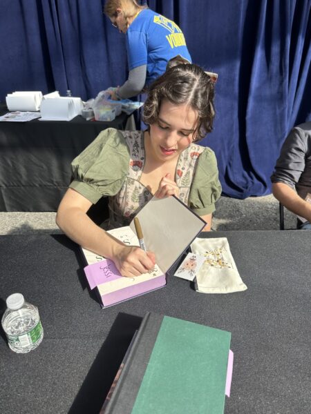 After snagging the Penguin pins and a ticket for Devious Prey, I went all the way back to Lit Alley to see Michelle Jabes Corpora. Her line was pretty short despite it being pretty close to 1. When I was in line, I noticed that people had ARCs of A Stage Set for Villains in the line next to me. I asked where they got them (it was a drop I really, really wanted!), and it was apparently a drop only at the ticketed signing, which I didn’t know about. The tickets dropped with the other ticketed authors a couple weeks before the event, so I had missed it entirely. I was pretty bummed. I tried to ask if there’d be another drop anywhere else, but no one knew.