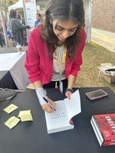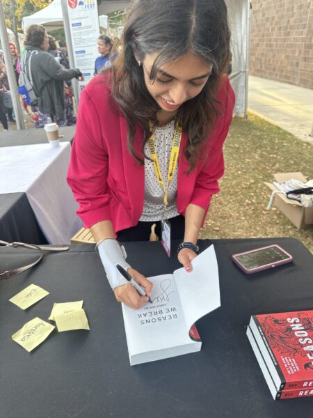 After that I packed my stuff up and told Ansley I was going to the 8 ball line and followed my other friend over there, where her husband was in line. We both jumped into that line and I was feeling pretty weird about it because we probably pushed people past the cap. Ansley ended up coming over to stand with us, too. When we were closer to the tent, we saw a line next to ours and one person had a book with a really cool cover. I asked about it so I could add it to my TBR and she was like, “oh the author is here signing and she’s got 25 copies available. There were only 18 people in the line, so Ansley and I decided to jump over to that line instead and just ditch the magic 8 ball line. I was starting to feel bad about cutting anyway, lol. So I got to meet Jasmeen Kaur Deo and get an ARC of Reasons We Break signed.