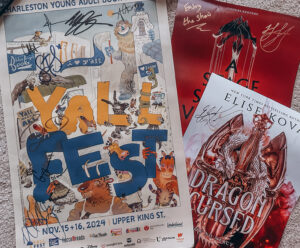 When they let us in, we stopped by the goodies table (I got a Grisha pencil case and tote, and THE BLOODY AND THE DAMNED!! Ahhh!! I was so freakin’ stoked because it’s my second most anticipated 2026 release and was my #1 drop I wanted of the whole weekend!) and then I went straight to Axie’s line. There was only one person in the regular line, so I decided to save my priority pass for Marissa. I knew Scott Reintgen was at 4 and wanted to get through Marissa’s line quickly so I could go see him. As we were standing there, people started piling into the priority pass line. I asked one of the volunteers if ALL of the priority pass people would be let in before us, and she said yes. (I am STILL fucking salty about this.) So I started to panic that I wouldn’t have enough time and went to the end of the priority line. I was kicking myself for not just getting into it first, but also didn’t want to waste my priority pass. And you know what? You know fucking what? They were NOT letting everyone in the priority line go first, they were alternating one from the regular line and then one from the priority line. I would have been next if I’d stayed where I was in the regular line. I was so fucking pissed, ya’ll. I went back about 15 people in line because of that. And I ended up not being able to leave for Poranek because the line took so long. When I realized I wasn’t going to make it to see her, I decided to just go back to the regular line (it was about the same length as the priority line) and save the pass for Marissa. I ended up being one of the last people through Axie’s line and got bitched at because I had her sign 3 books and my tote, and she was about to sign a TGWFBtS print for me when the attendant came and cut me off. So I didn’t get that print or my poster signed.